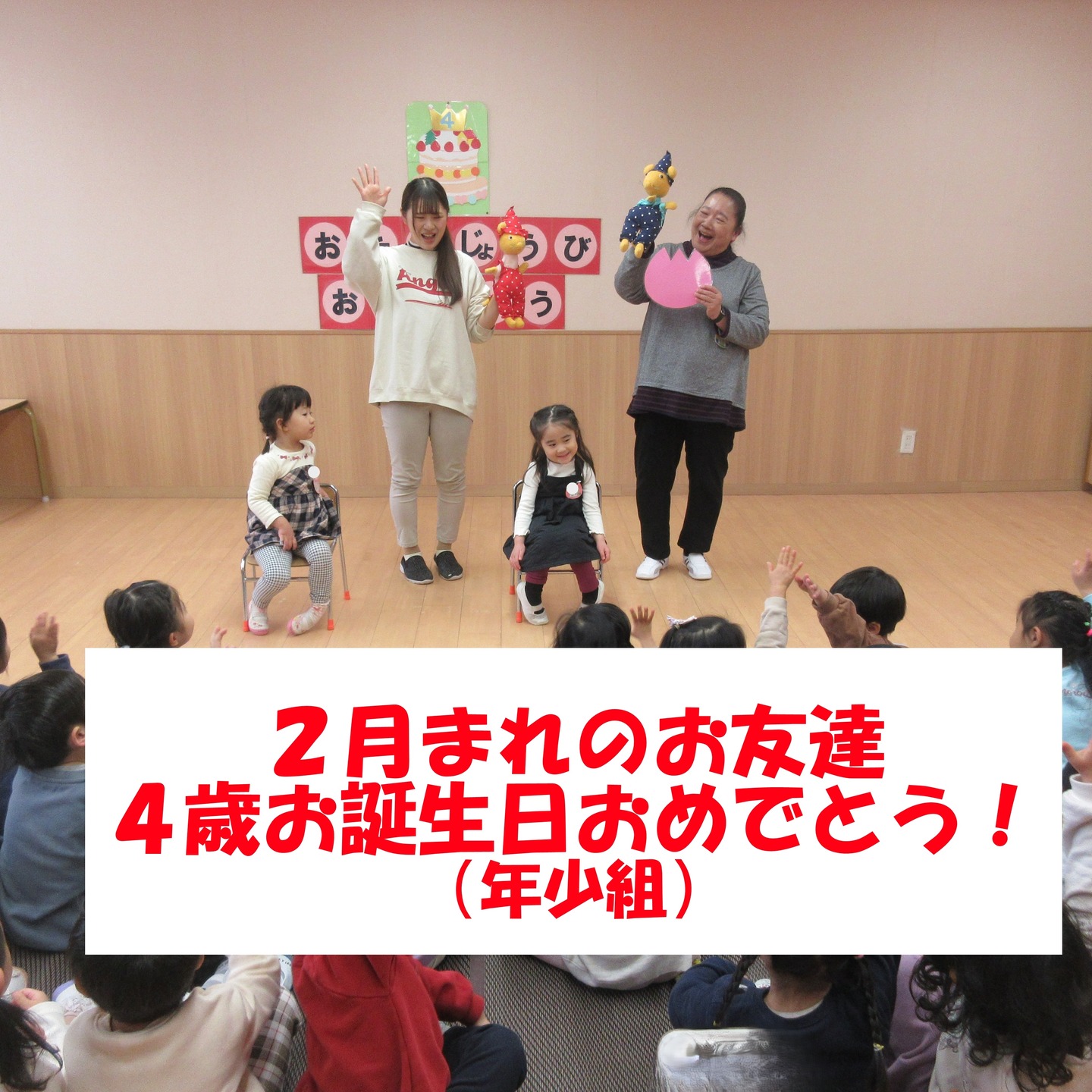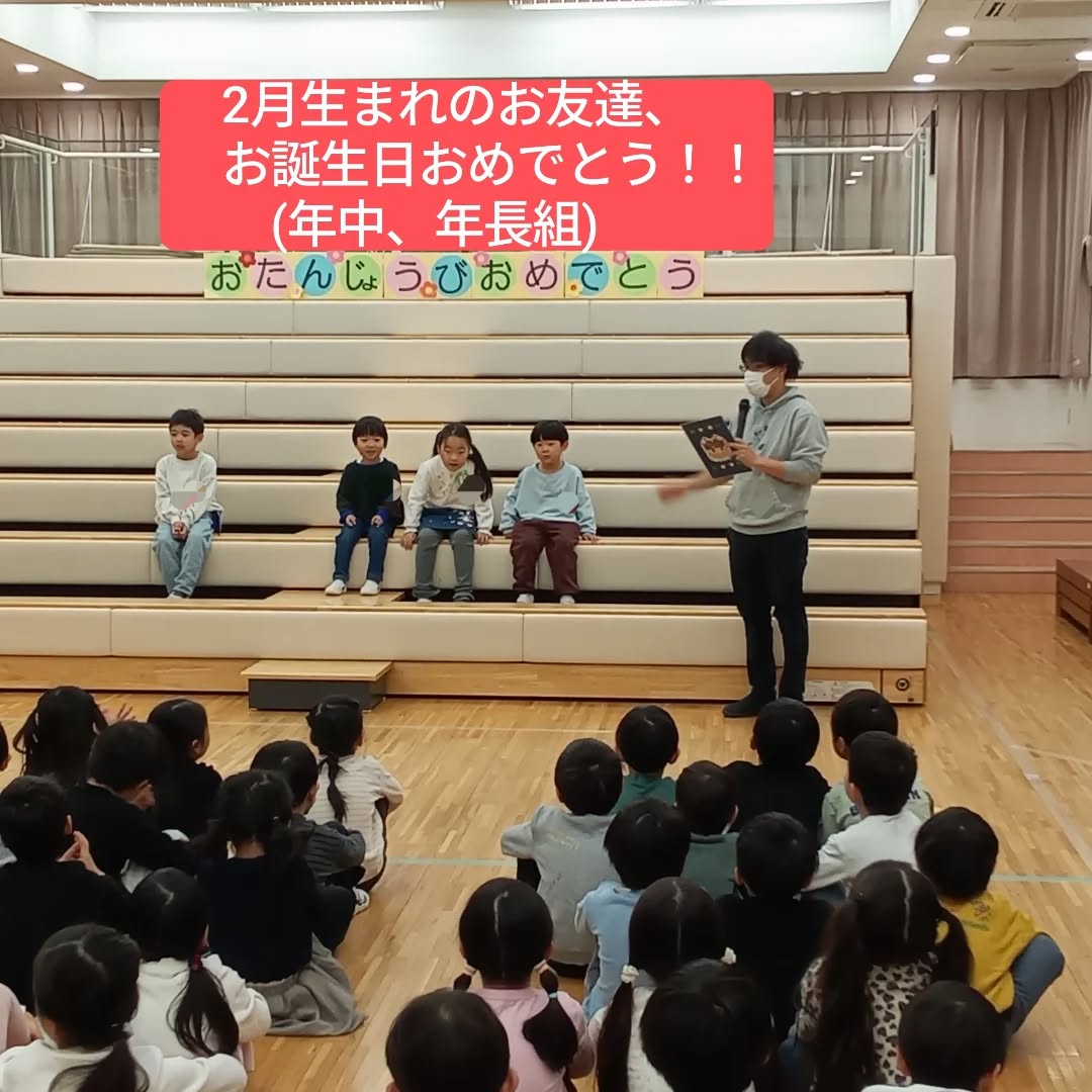 2026年2月18日(水) 年少組で2月の誕生会を開催しました。 いよいよ今年度の年少組誕生会も残すところ2回となりました。 今月は、うさぎ組の2名のお子さんのお祝いとなり、年少のもう1クラスのりす組には該当のお子さんがいませんでした。同じクラスのうさぎ組の子ども達はもちろんのこと、りす組の子ども達も隣のクラスのうさぎ組の友達を一緒にお祝いしました。 普段の園生活の中で、クラスの枠を超えて共に活動したり、クラスを行き来しながら過ごしたり・・・そういった体験の積み重ねが、他のクラスの友達にも優しい気持ちを持つことにも繋がっているのではないでしょうか。 誕生日を迎えた二人のお子さんは、たくさんの友達に注目されながらも、名前や好きな物インタビューに笑顔で応えてくれました。 そして、ついに来月で年少組の誕生会もラストとなります。 3月生まれのお友達、お待たせしました!!年少組みんなでお祝いしましょうね。もちろん、「ぐりとぐら」もお祝いに駆け付けますよ! #文京幼稚園 #文京学院大学文京幼稚園 #文京区幼稚園 #文京区私立幼稚園 #文京区保育園 #幼稚園誕生会