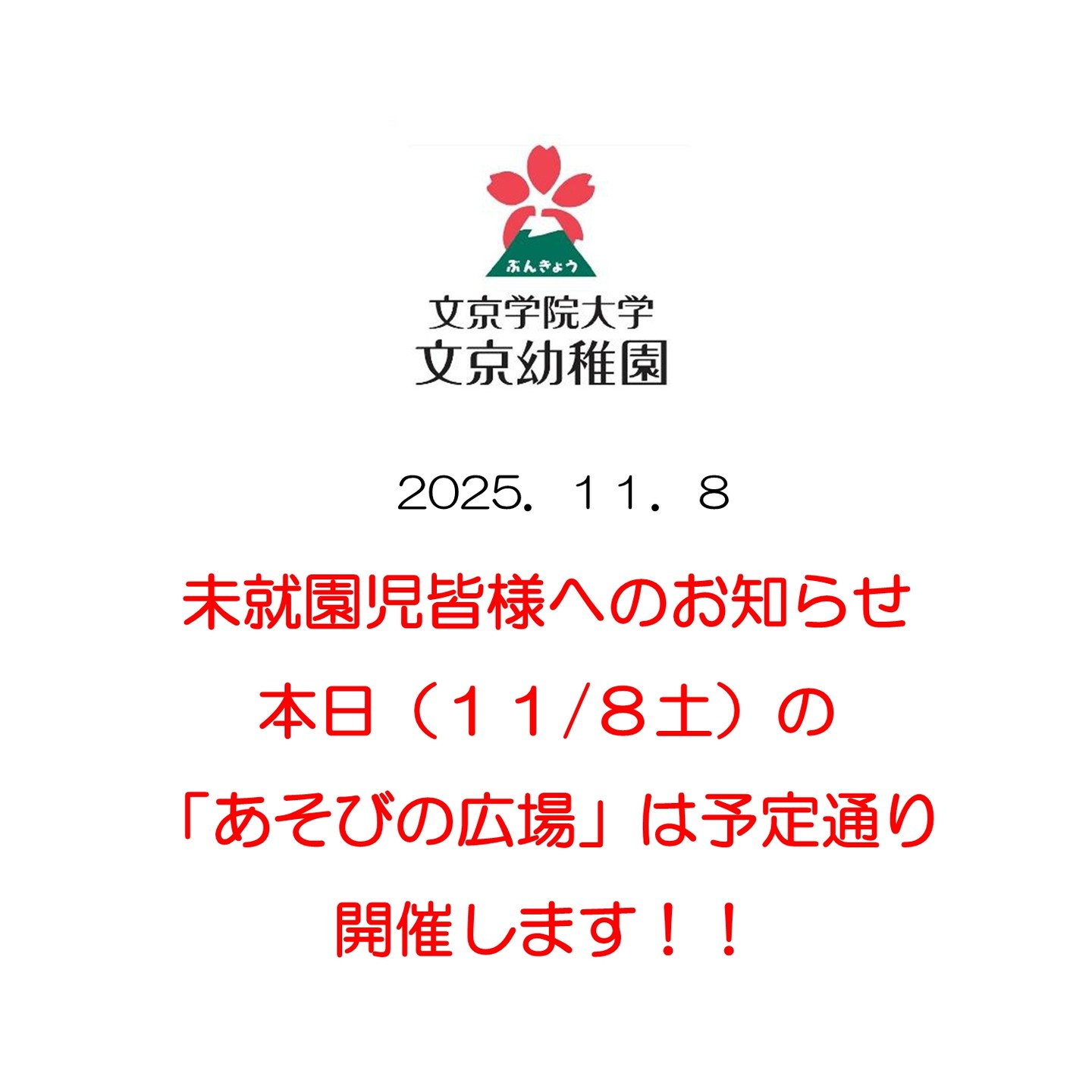 11月8日(土)あそびの広場についてお知らせします。 ●本日は予定通り開催いたします。事前申し込みをいただきました未就園児親子の皆様のお越しをお待ちしております。 ①来園時間 9時20分~30分までに、幼稚園正門よりお越しください。※9時15分までは入場いただけないため、時間調整をしてお越しください。 ②欠席や遅刻の連絡 体調等により欠席される場合、また受付時間より遅れる場合には、園まで必ず電話連絡をお願いいたします。 ③お子さんの靴や水筒の取り間違えにはお気を付けください。 お子さんが同じ形状の靴や水筒を自分のものと思い込み、取り違えが起こることがあります。必ず記名していただくと共に、保護者の方の管理で靴や水筒を取り扱っていただくようお願いいたします。 ③お子さんの愛用品について お子さんの大切なぬいぐるみやおもちゃを持ち込みますと、園の遊具等に紛れてしまうことがあります。 愛用品は保育室内や園庭には持ち込まないようご協力をお願いいたします。 ♪♪皆様のお越しをお待ちしております。幼稚園に関する質問もお気軽にお尋ねください。 #文京幼稚園 #文京区私立幼稚園 #文京区幼稚園 #文京区保育園 #令和8年度園児募集 #幼稚園未就園児親子活動