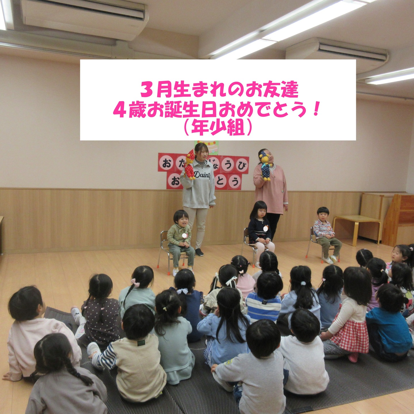 2026年3月4日(水) 3月生まれのお子さんのお誕生会を 開催しました。 4月から毎月順番に行ってきた年少組の誕生会も、この3月がいよいよ最後になりました。 今月は3名のお子さんのお祝いをしました。一年間、この日を待っていた3月生まれのお友達です。ちょっぴり緊張もしたようですが、笑顔でインタビューに答えてくれました。 2クラスが一つの部屋に集まって、アットホームな中で開催されることが年少組の誕生会の良さであり、魅力です。その魅力の一つを担っているのは「ぐりとぐら」の登場です。4月から毎月年少さんの一員として参加する「ぐりとぐら」子ども達とはすっかり、「あ・うん」の呼吸です。 4月からは年中さん。今度は5歳になりますね。どんなお誕生会が待っているのかお楽しみに!! #文京幼稚園 #文京学院大学文京幼稚園 #文京区私立幼稚園 #文京区保育園 #幼稚園誕生会
