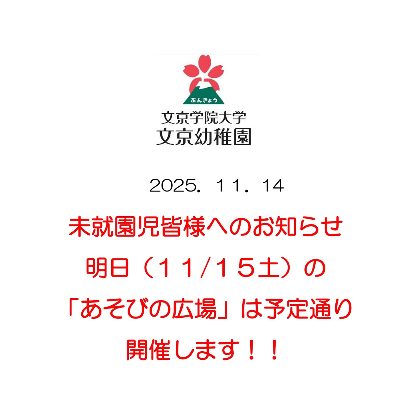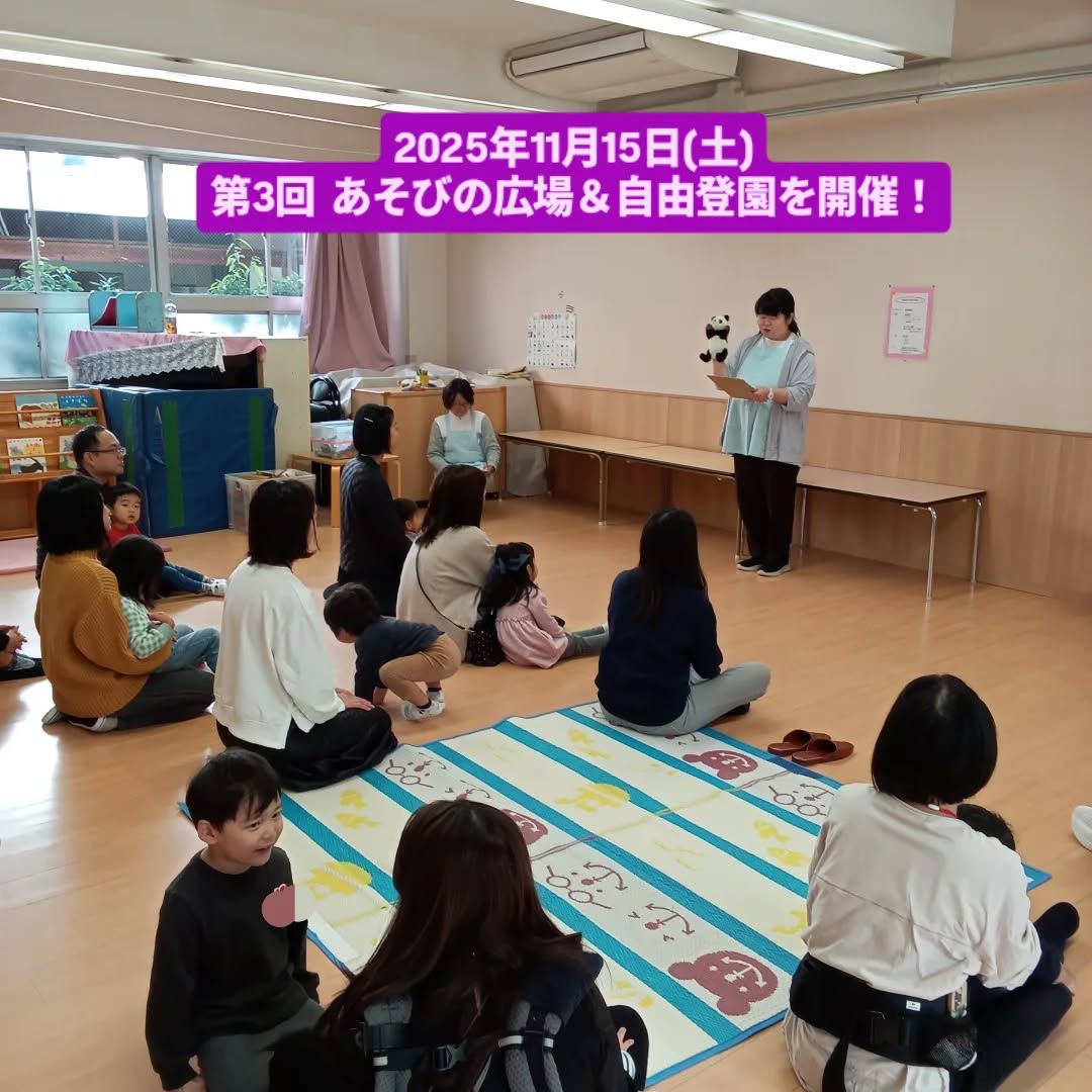 2025年11月15日(土)、第3回あそびの広場を開催しました。1歳児の親子さん、そして今度の4月から本園に入園予定のお子さんと保護者の方が参加してくださいました。